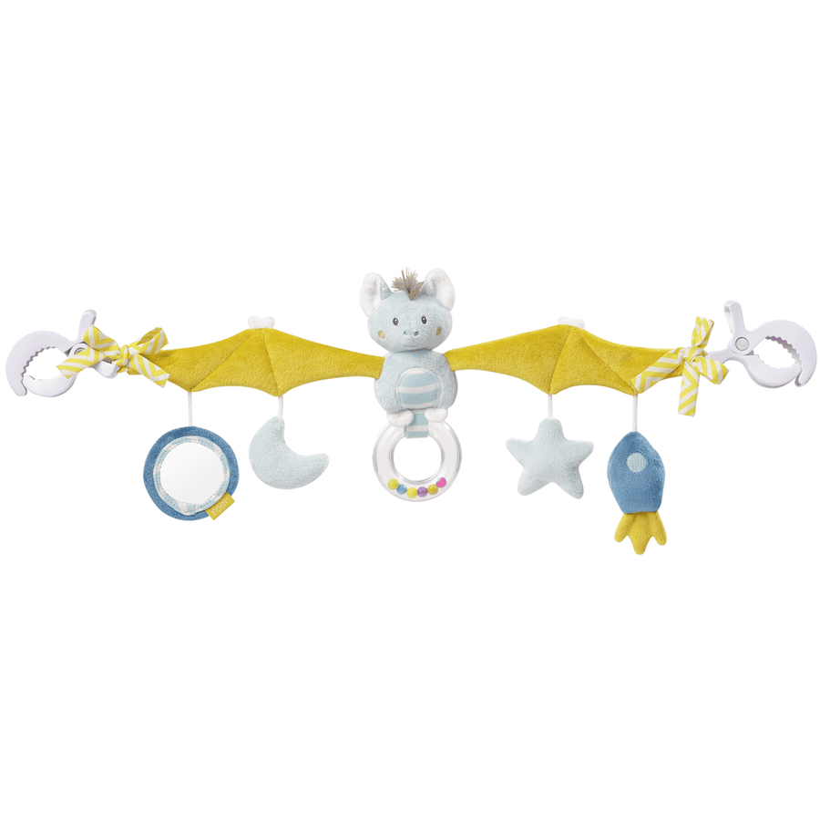 La belle chauve-souris stimule le sens du toucher de bébé avec ses ailes larges. Les pendentifs stimulent la préhension et la coordination des yeux et des mains des enfants. L’anneau hochet est facile à saisir, stimule la curiosité de bébé tout en l’invitant à le secouer avec ses perles aux couleurs de l’arc-en-ciel. Les perles roulent à l’intérieur du tube. Les petits enfants comprendront vite comment le jouet fonctionne. La fusée aux sons de hochet, l’étoile à pouet pouet et la lune attirent l’attention de bébé. Un petit miroir permettra à bébé de bien se regarder. 2 crochets blancs permettent une fixation facile de la chaîne sur un cosi, une poussette, un parc bébé ou un lit bébé. Ce jouet apprend aussi à bébé comment fonctionne le monde pendant ses promenades.